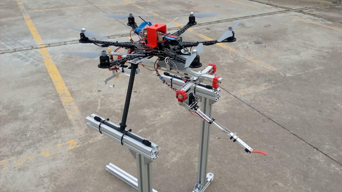 Students at the University of Seville have developed an airborne manipulation robot, a drone with a robotic arm. It can be used to reach remote work areas or those located at high altitudes easily, quickly and inexpensively. Therefore they are well suited for applications related with inspection and maintenance in scenarios like oil and gas refineries, chemical plants, wind turbines, solar plants, or power lines. The operation conducted by an aerial manipulator usually involves some kind of physical interaction with the environment, for example, in the execution of grasping tasks, or during the application of contact forces. The estimation and control of the interaction wrenches exerted over the aerial platform in situations like these is necessary to prevent the stability of the control system being compromised, reducing the risk of collisions and crashes. The design and development of compliant joint manipulators also aims to increase safety during the interactions on flight, exploiting the energy storage capacity and the passivity properties of springs in order to protect the aerial robot against impacts and overloads.